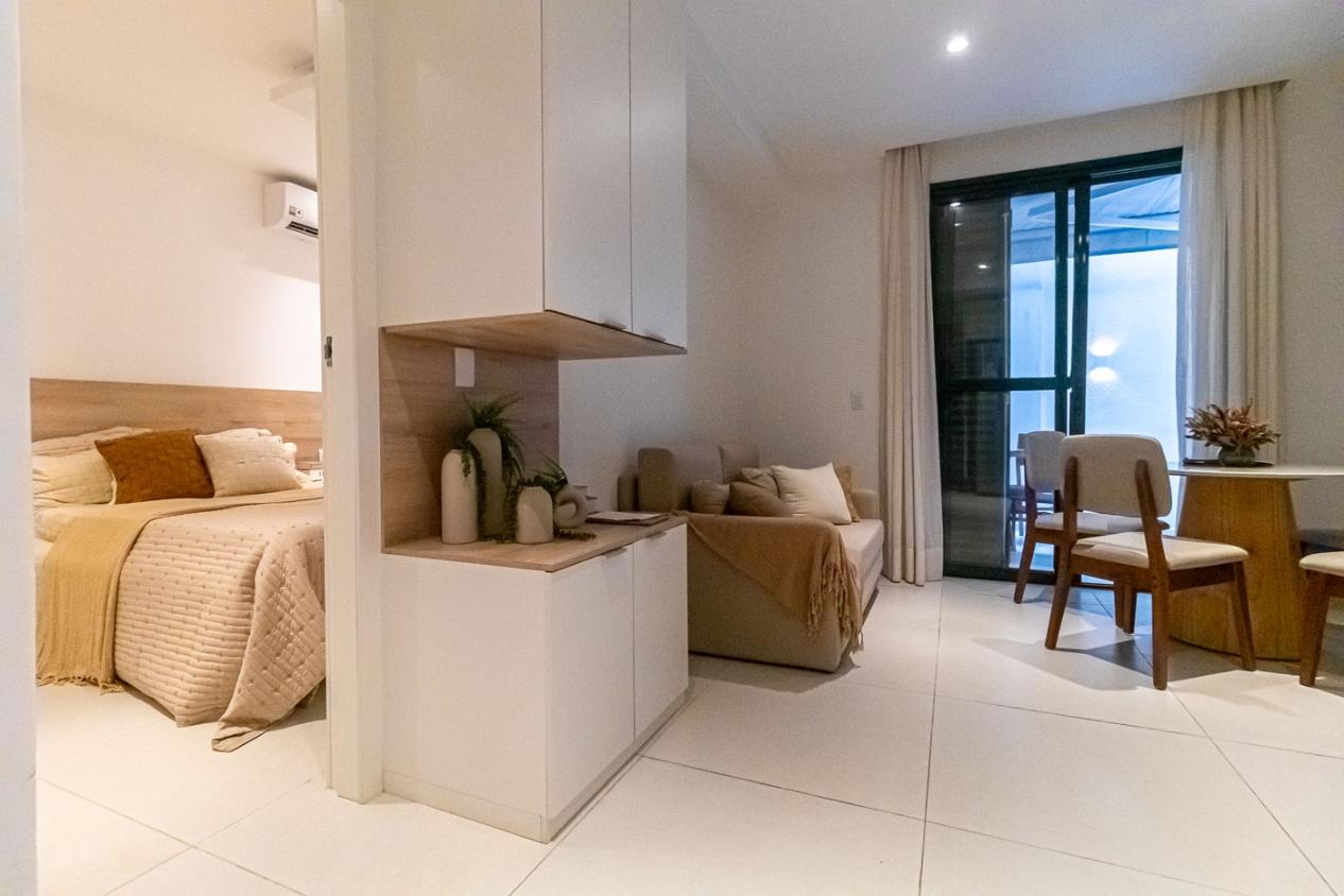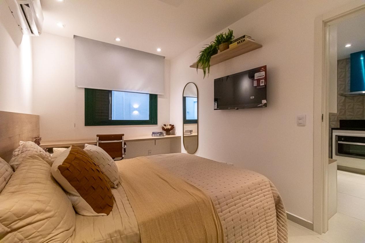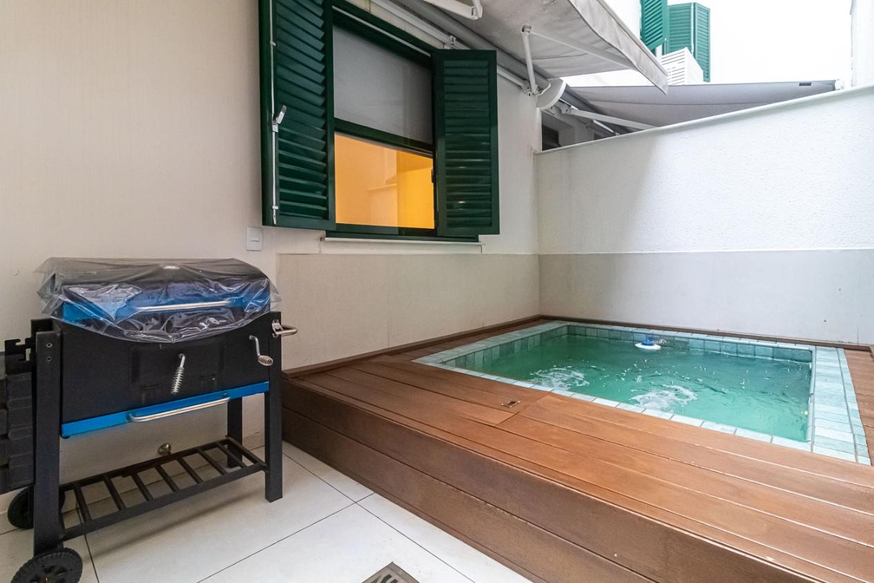 Apartamento garden com piscina com hidromassagem e cromoterapia, toldo elétrico com proteção solar para maior privacidade, deck em madeira ecológica, bancada gourmet e armários; composto por: