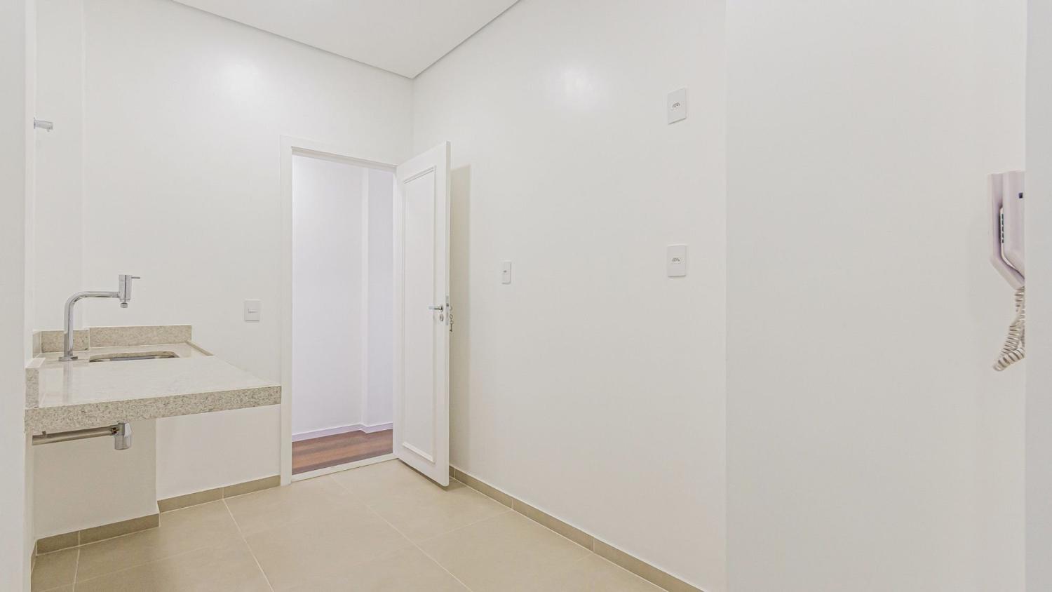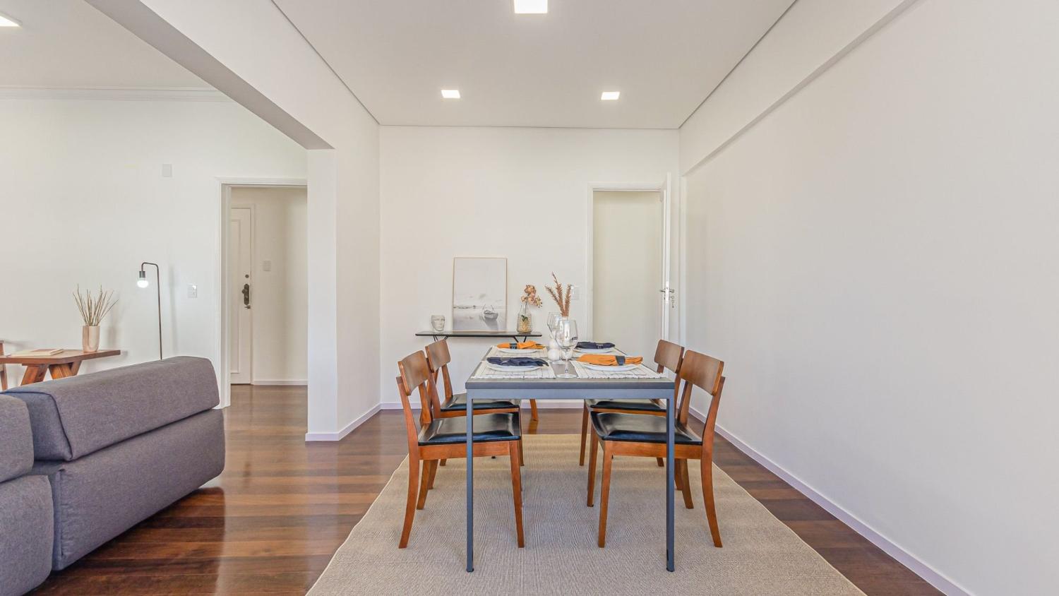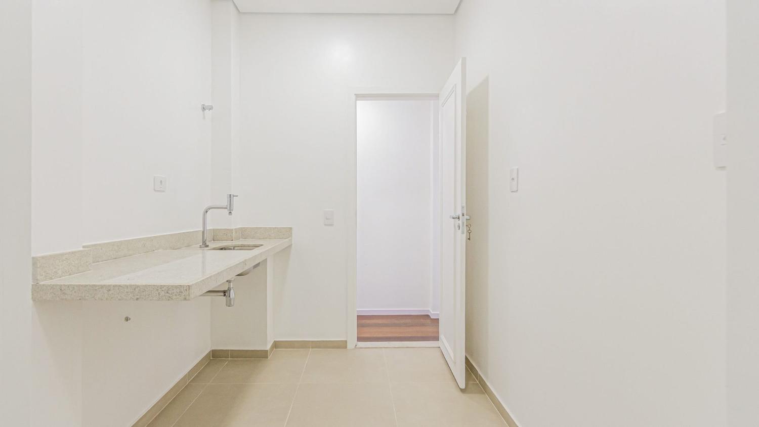 Apartamento de 139 m² composto por, sala ampla e iluminada integrada a uma varanda frontal; 2 quartos com armários planejados, sendo que um deles possui acesso direto à varanda; cozinha espaçosa integrada à área de serviço e depósito; banheiro social.