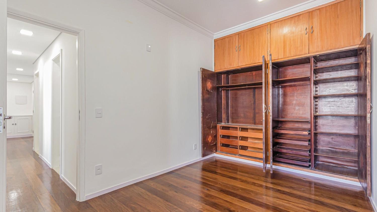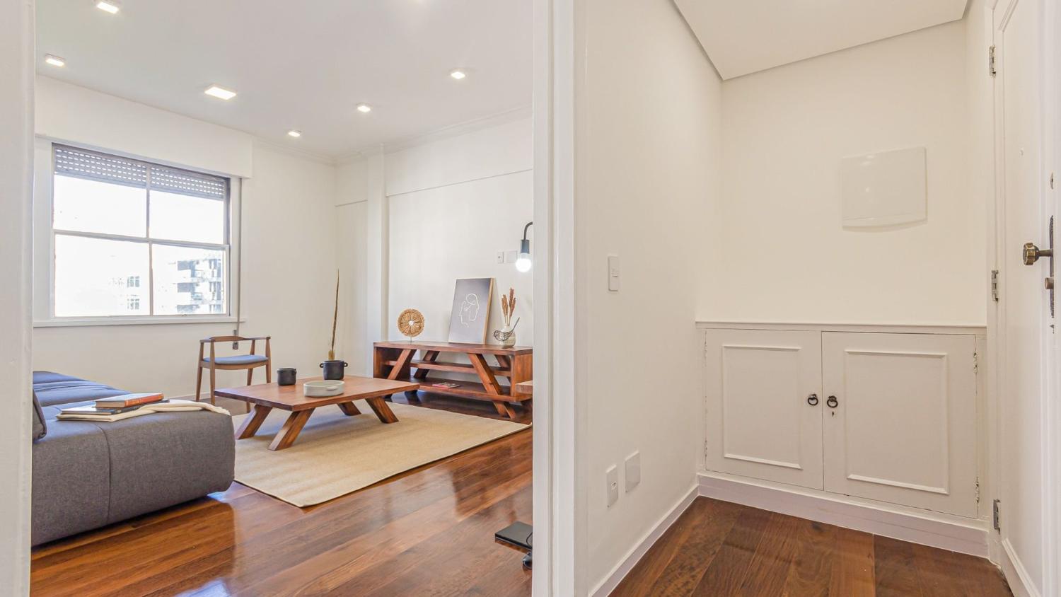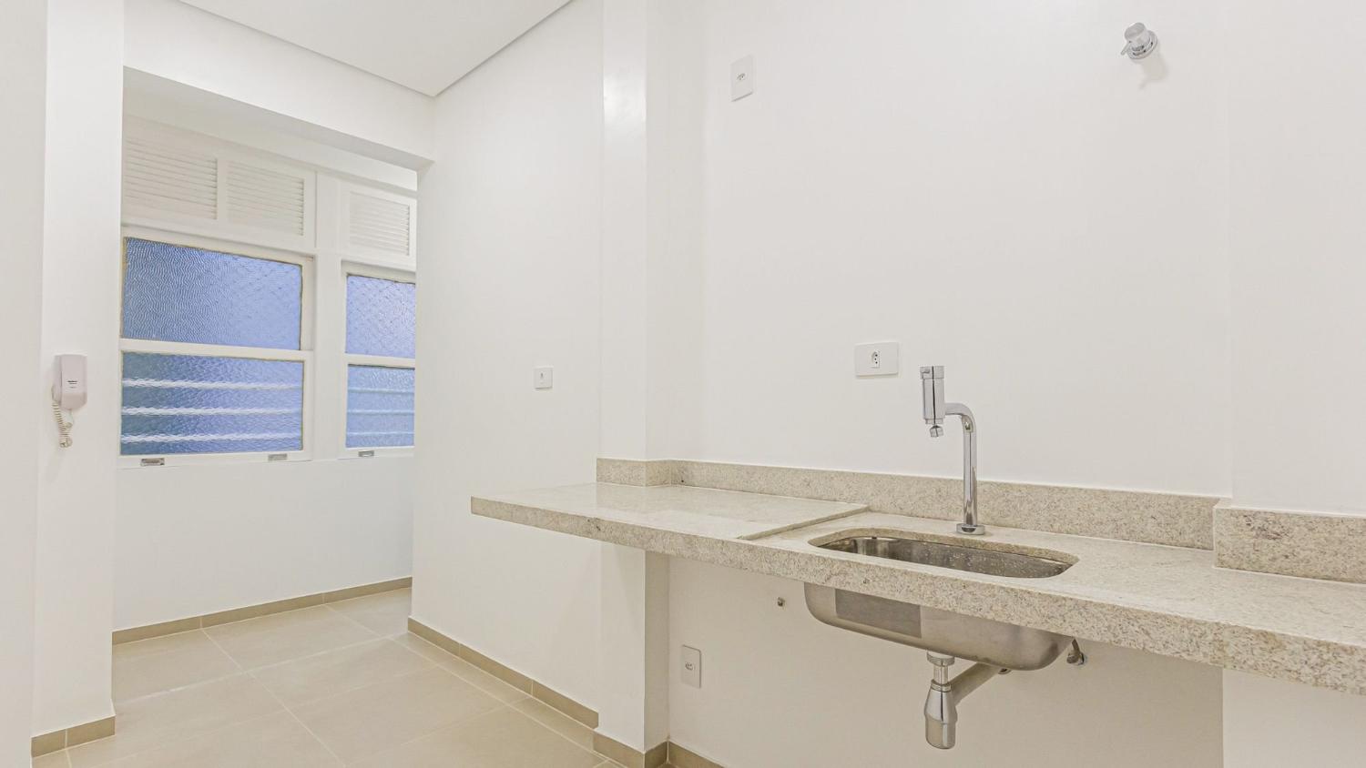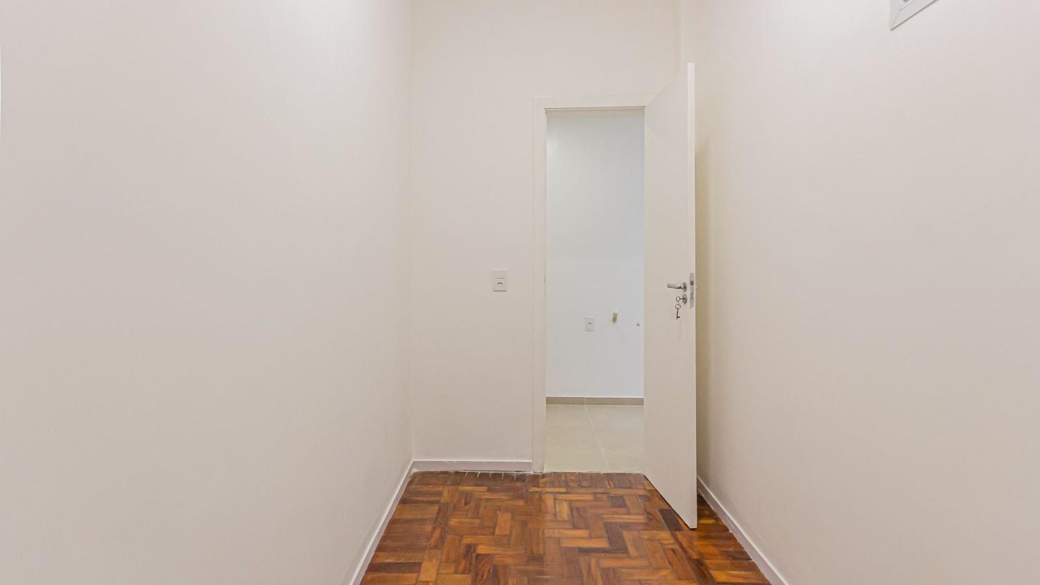 Apartamento de 139 m² composto por, sala ampla e iluminada integrada a uma varanda frontal; 2 quartos com armários planejados, sendo que um deles possui acesso direto à varanda; cozinha espaçosa integrada à área de serviço e depósito; banheiro social.